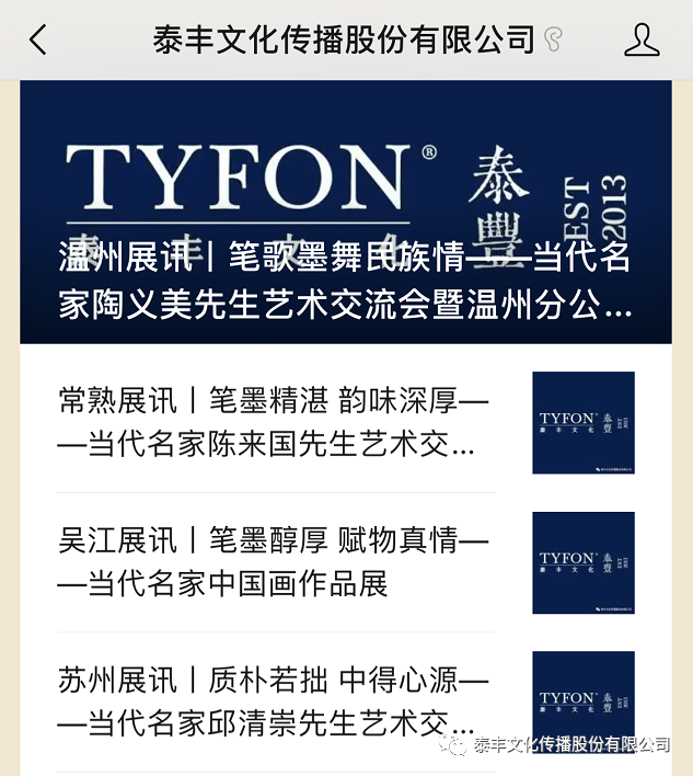 以泰丰文化为例,泰丰文化微信公众号每周固定时间会推出展览预告,艺术爱好者只需关注泰丰文化微信公众号(泰丰文化传播股份有限公司),就可以详细的了解本周的展览信息,根据自身的爱好倾向或者地理位置来选择想要参加的展览。