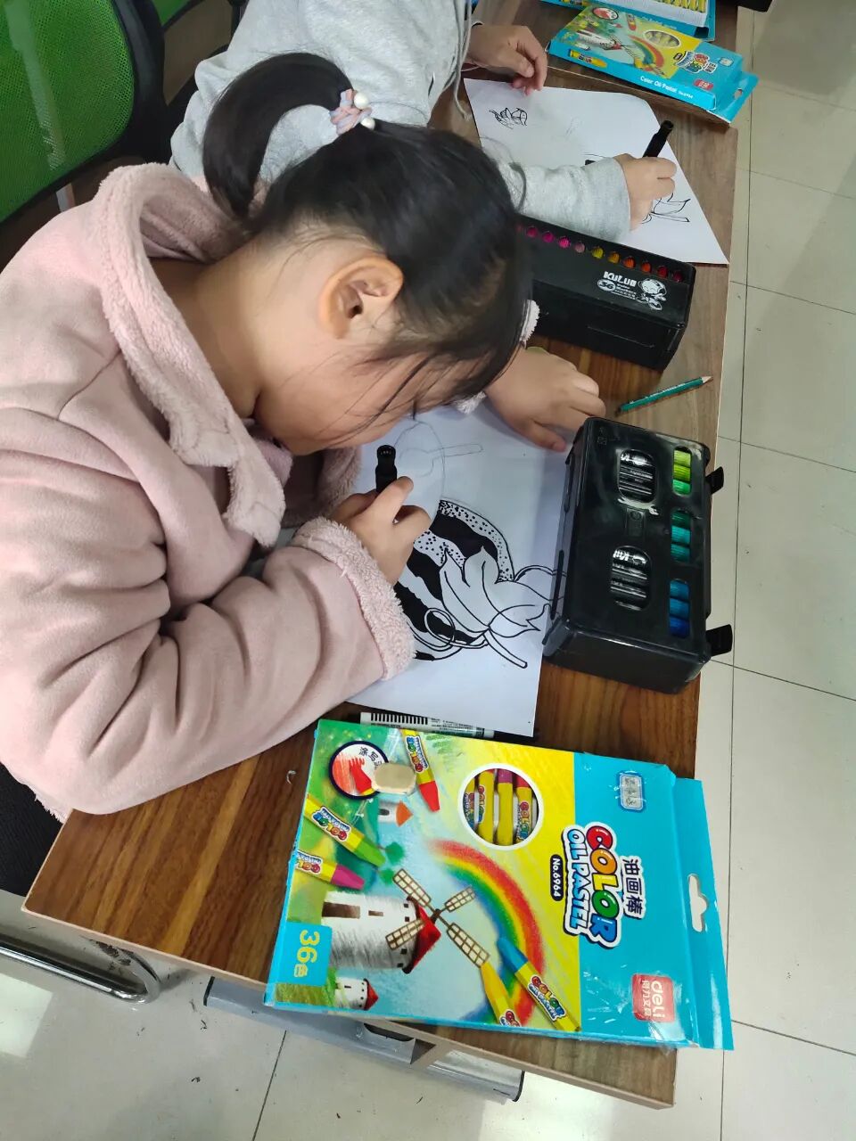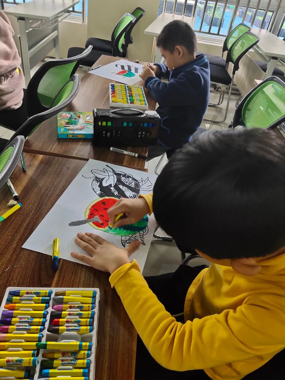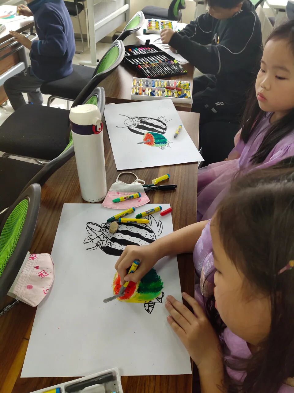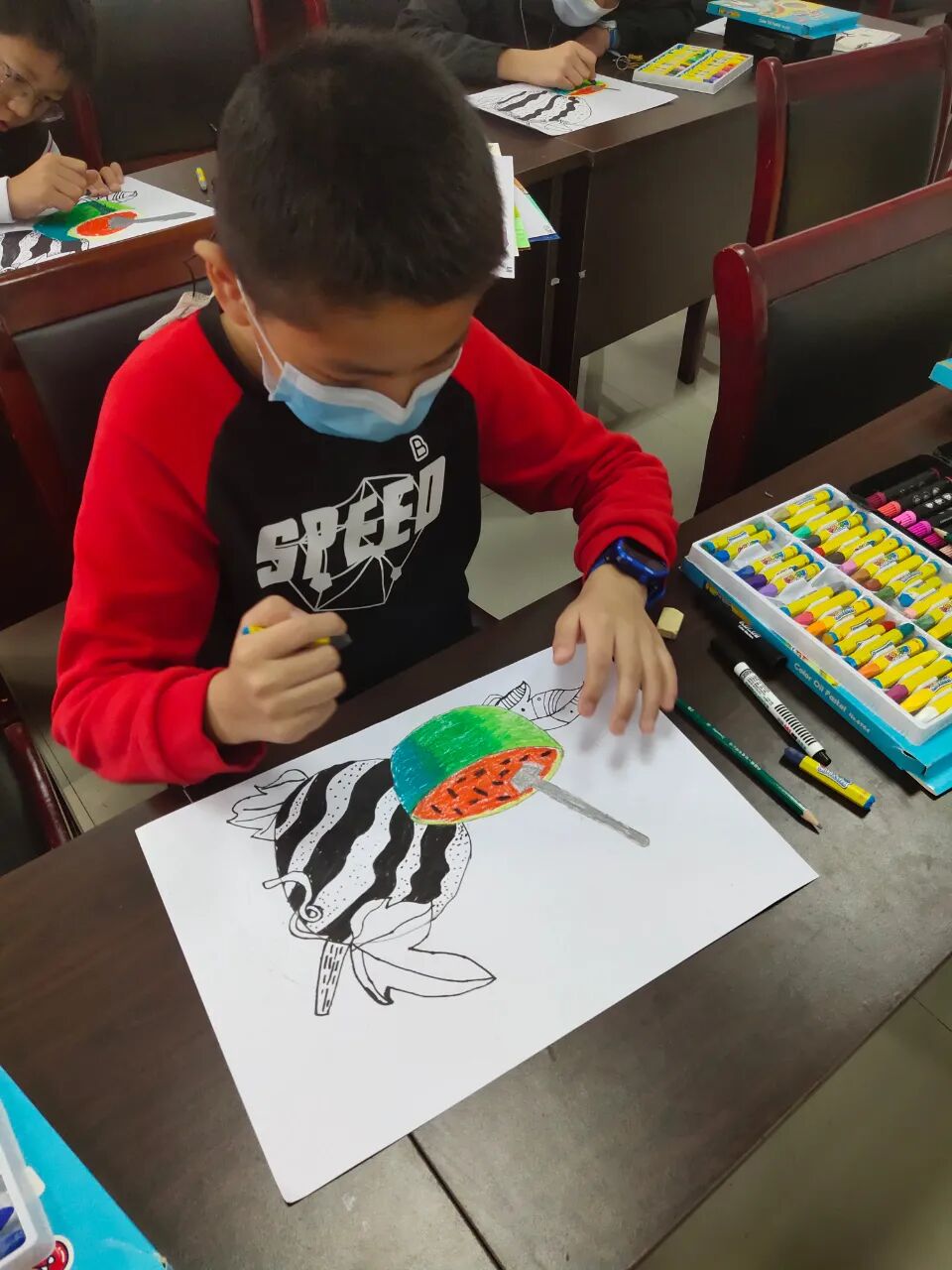 本期绘画课堂采用设色和线描的方式,我们用了红色和嫩绿,翠绿、深绿的油画棒,还有勾线笔,小朋友们也可以发挥自己的想象,给画面涂上其他的颜色。