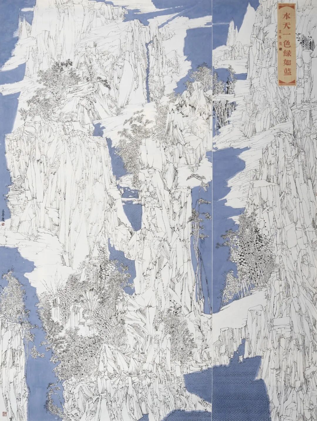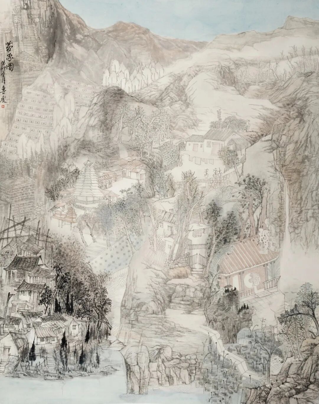 在以线条勾勒山水形态的同时,王专庆注重对山石轮廓、走势的把控,使整幅画面在突出呈现线条美感的同时,画面的整体布局和意境表现也完美的表达。同时,王专庆对细节的刻画无微不至,以皴擦和墨染出独特的山石肌理,悉心勾画点缀在山水之间的屋舍、人物、雕像等,使画面内容丰富的同时达成意境的统一和谐。