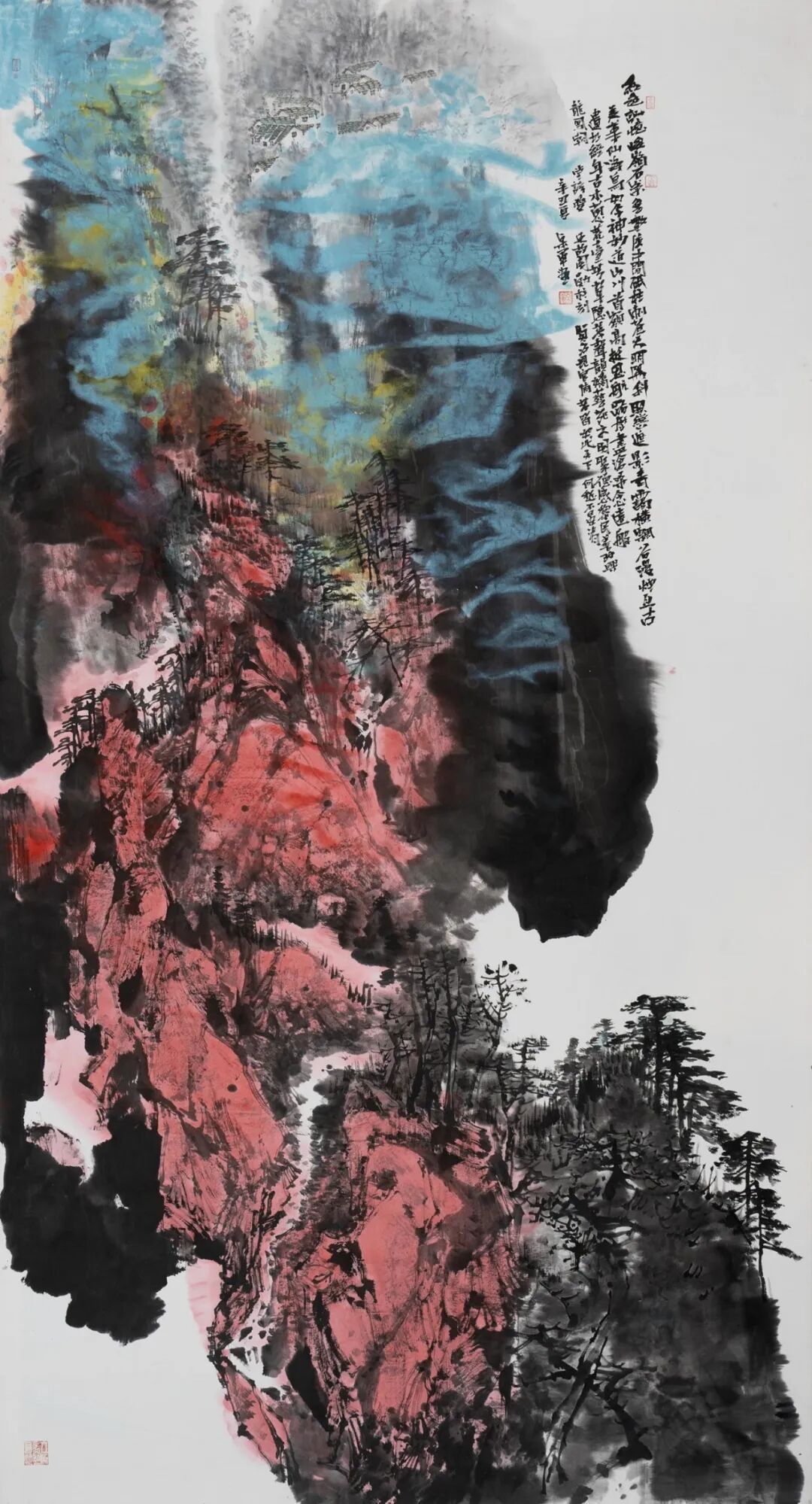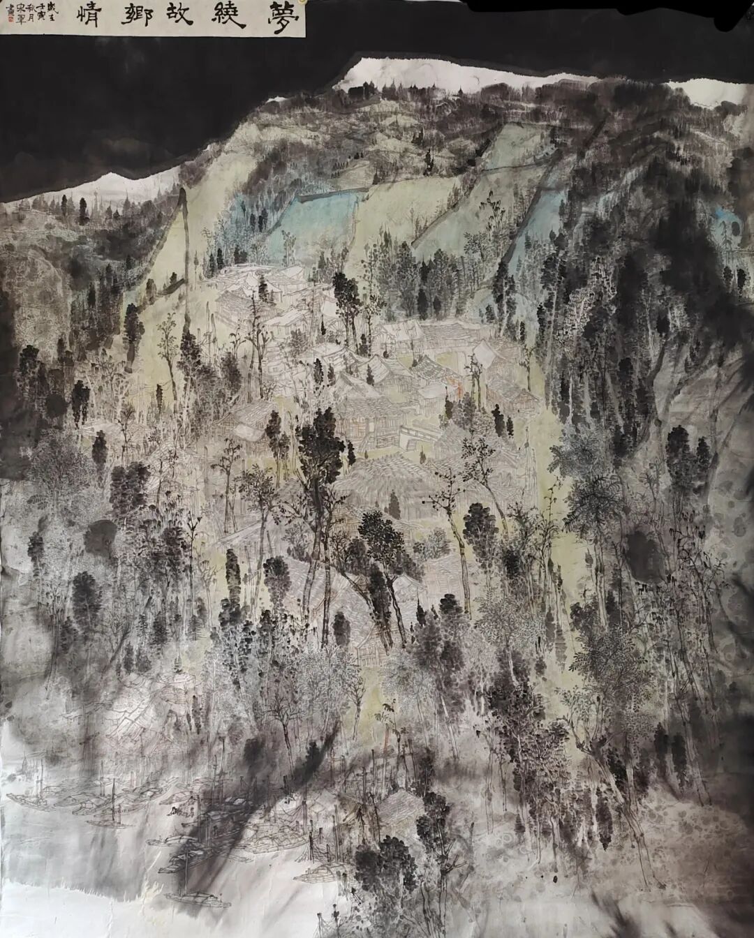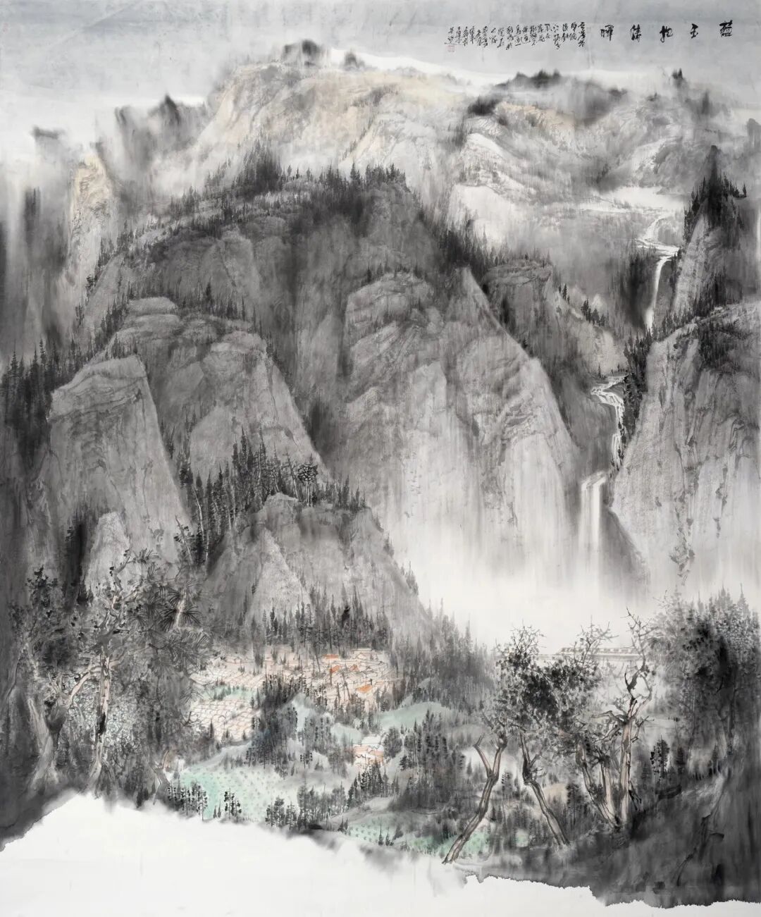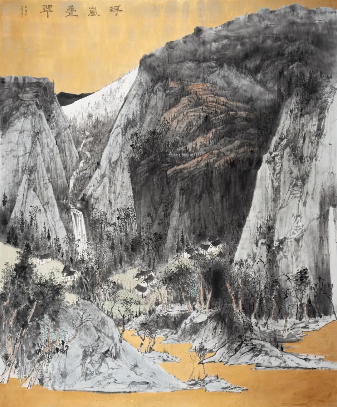 宋军对墨色的巧妙运用,也使得画面中的自然元素仿佛被赋予了动态的生命,呈现出一种流动的韵律感。在墨色的厚重和浓淡之间,和色彩的明丽黯然对比中,山水由近及远的立体呈现,画面宏大而内容细致丰富,更加生动的展现了大自然雄伟壮阔、包容万象的深刻内涵。