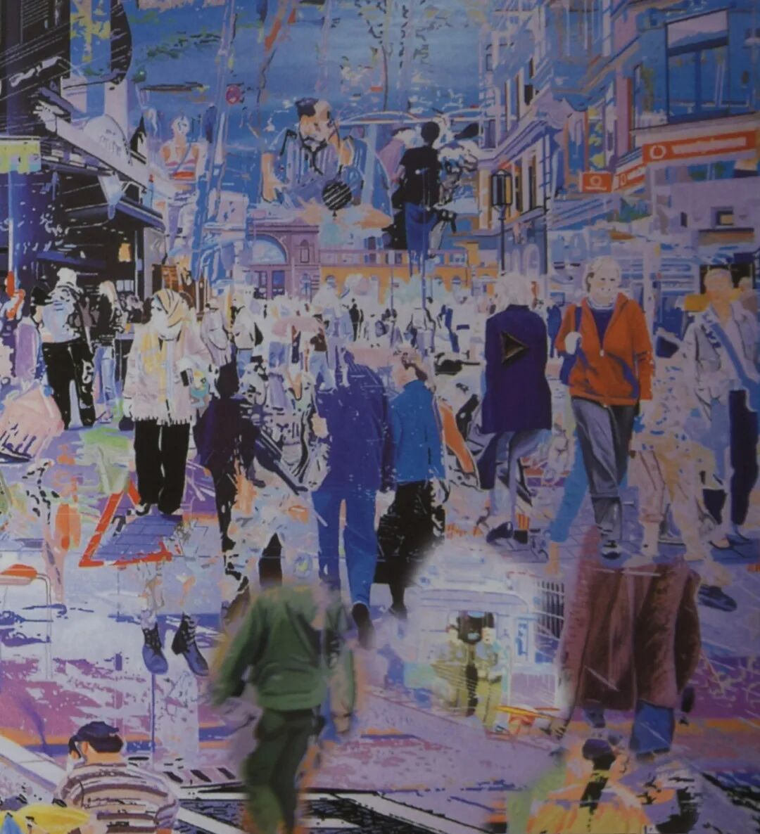 她的作品《城市节奏》就借鉴油画创作的形式,运用极具现代审美的表现手法,再虚实交错的人物形象、充满时空交叠的城市空间内创作出新的视觉语言效果,不仅使作品更具时代感,而且赋予了作品新的质感和表现力。
