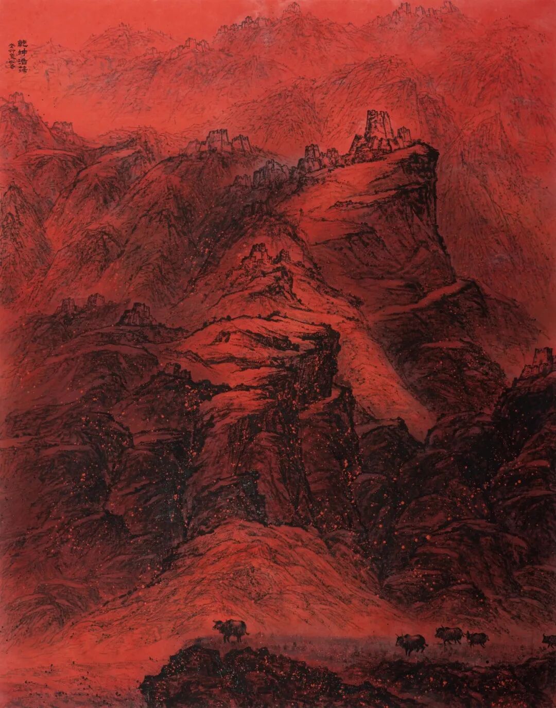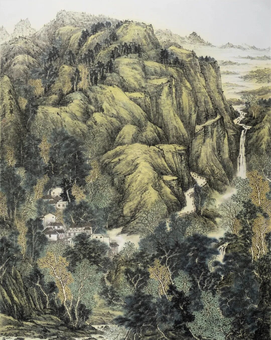山水艺术承载着深厚的文化内涵和哲学思想,刘红春在巍峨高耸的山林之间,营造一种葱郁苍润的勃勃生机,赋予山川蓬勃苍劲的生命张力,同时又将雄伟的山脉和柔和的水流形成鲜明对比,传达出一种力量与柔美的统一,雄厚旷远的气势之中深藏无限包容之意。