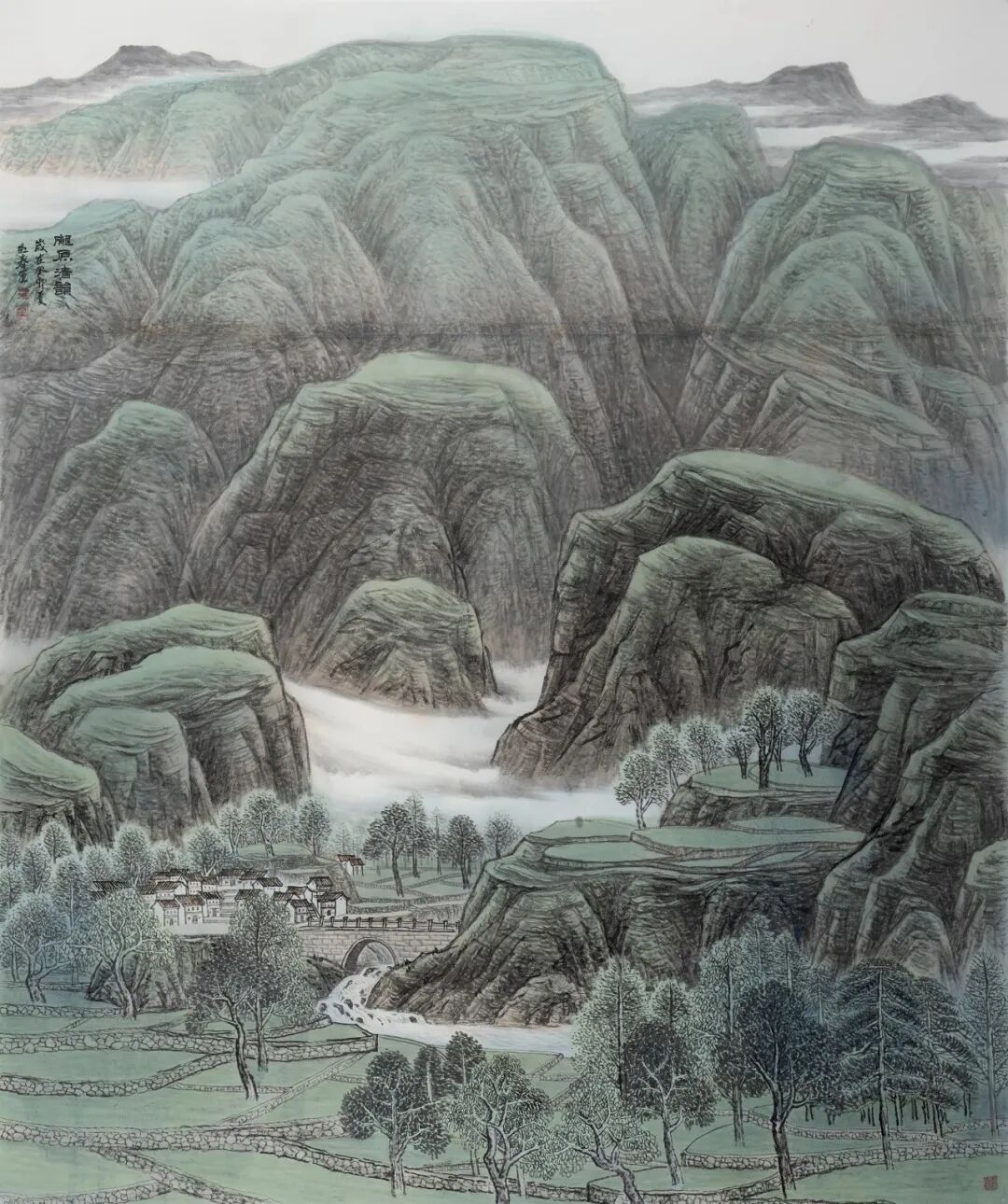 她的山水画常常表达出一种超然物外的境界,山水之间,云雾缭绕,溪流潺潺,宛如仙境,仿佛时间在此停驻,让观者心生神往,神思畅游于山水意境之中,解构浩瀚人生的真谛。