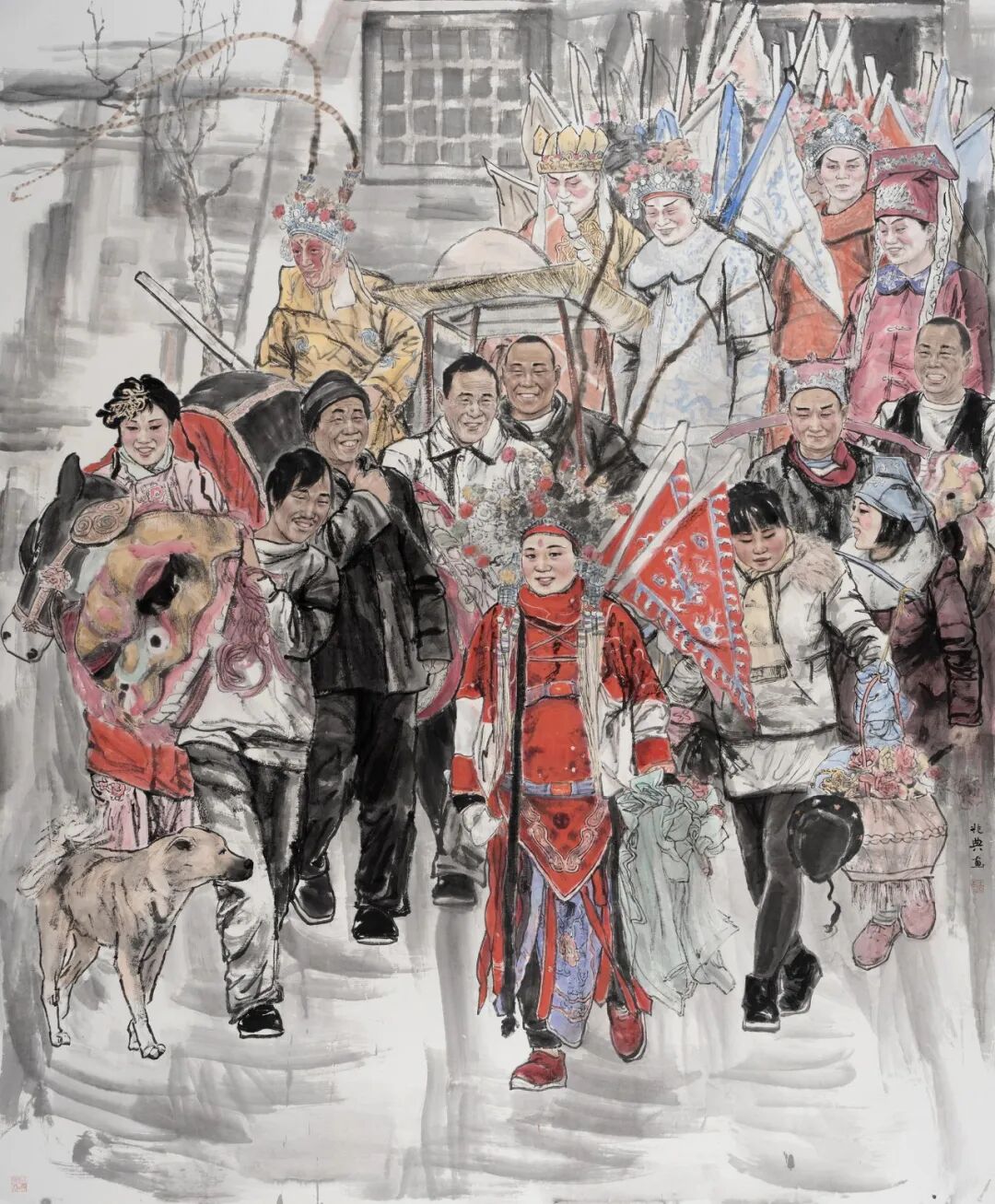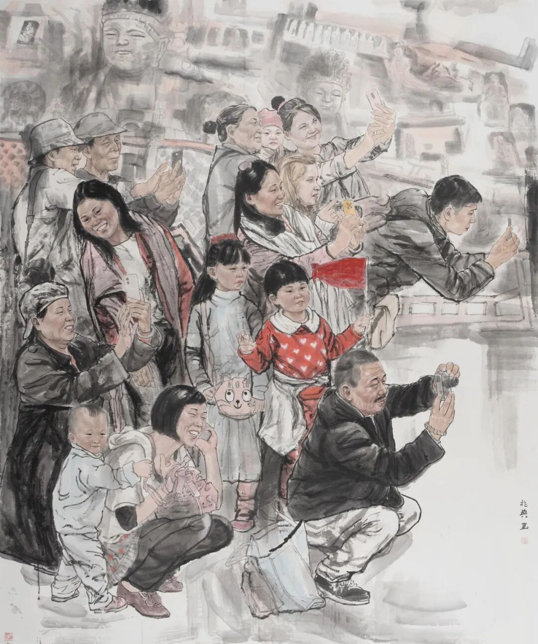 王兆典在创作水墨人物画时,往往会结合现代的审美和技术,探索新的表现形式。他会在传统技法的基础上,加入个人的理解和现代笔墨技巧,通过对宏大场景自如流畅的描绘,以及对人物外貌、动作、表情等精气神的刻画,展现出自身超强的笔墨功力。