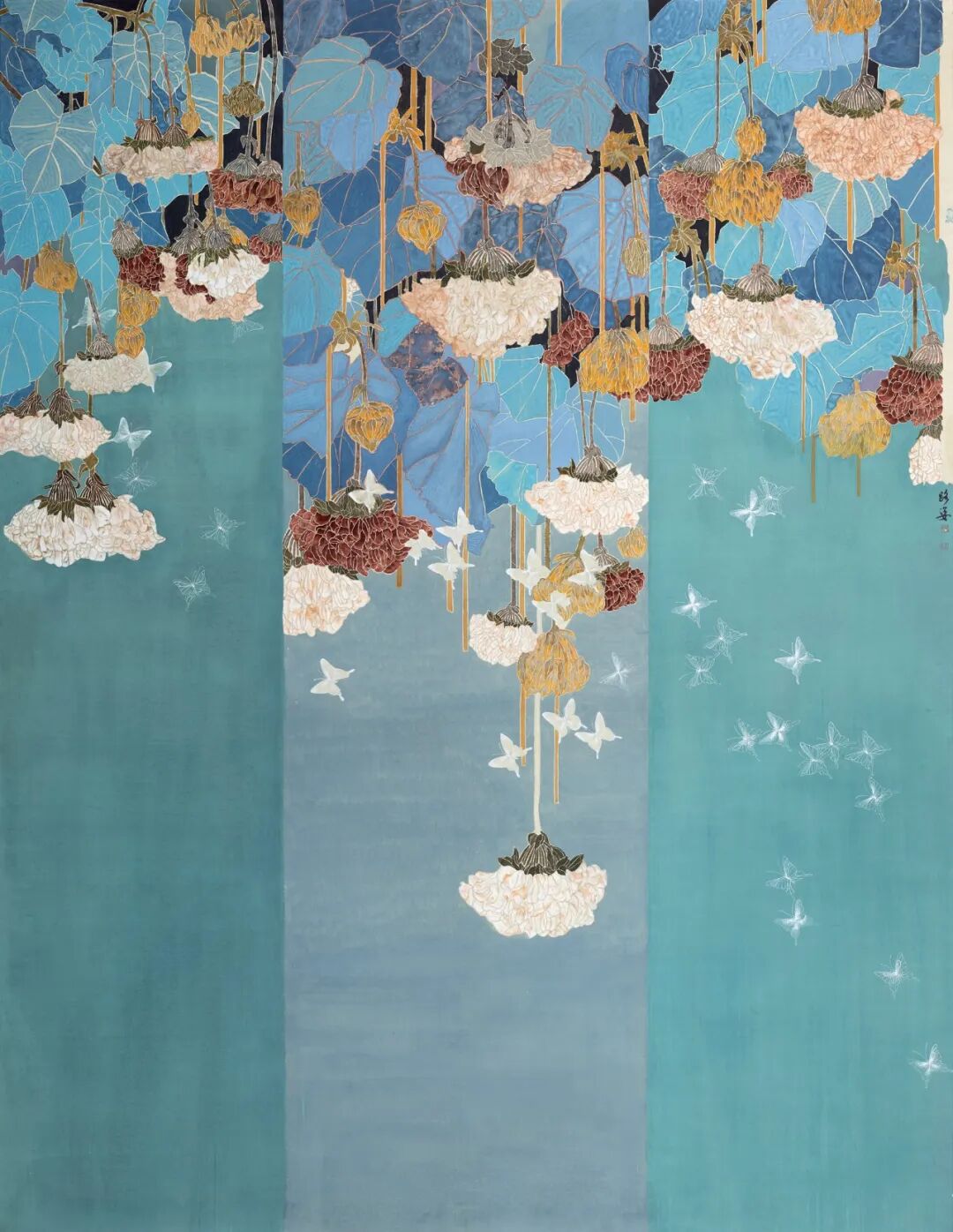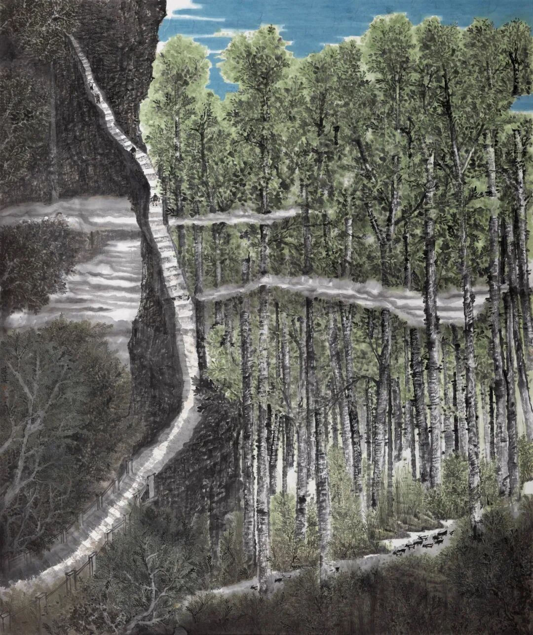 山水画是李路姿笔下的另一大亮点。她以独特的构图和色彩运用,营造出一种超脱尘俗的山川意象,同时又不失对自然之美的细腻描绘;花鸟画中,花鸟栩栩如生,富有生命力,既有传统花鸟画的雅致,又融入了现代审美。这些作品展现了自然界的生命勃发,传递出一种和谐共生的美好愿景。