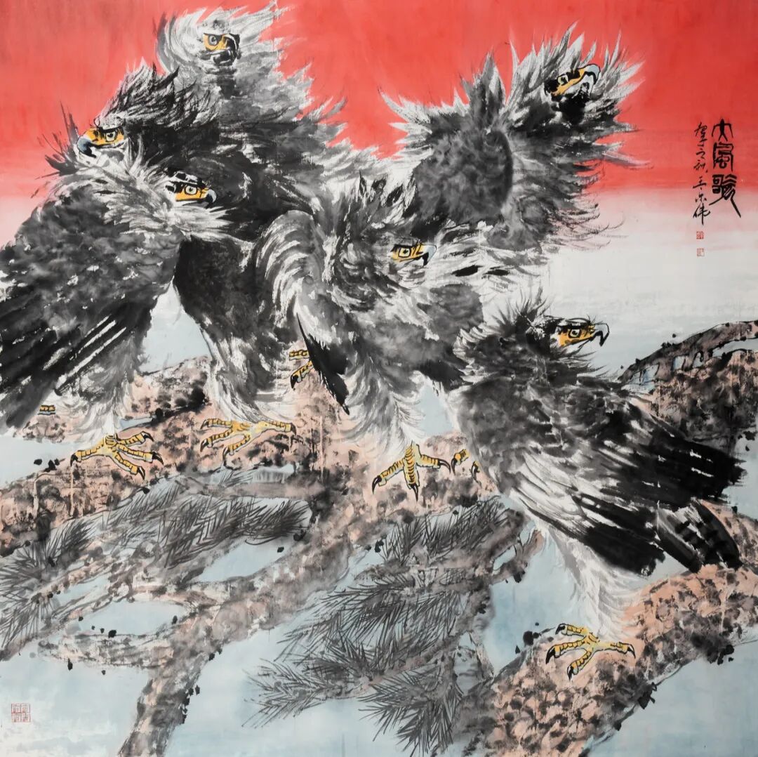 这幅《大风歌》是一首赞美生命、颂扬力量的诗篇。王专庆以雄浑之势,展现了几只雄鹰栖息于枝头的景象,雄鹰或昂首挺立,或展翅欲飞,它们的眼神锐利如炬,透露出无尽的威严与力量,黑色的羽毛与灰色的身躯在红色的背景映衬下更显深邃与庄重。