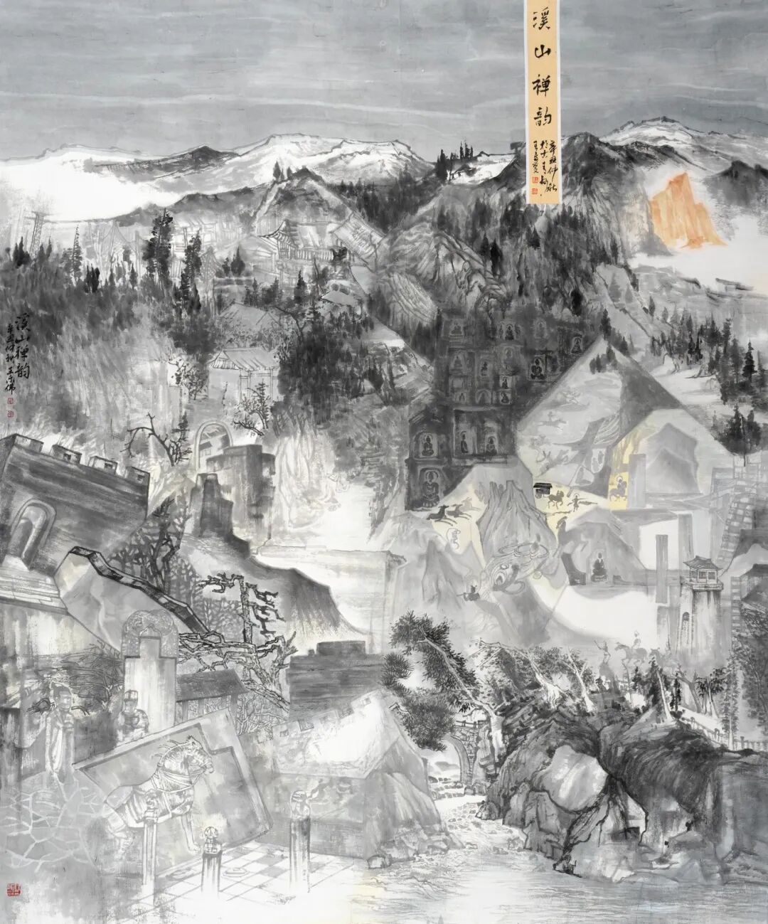 作品《溪山禅韵》以其独特的艺术魅力,静静诉说着山川之灵与禅心之韵的和谐共生,巍峨挺拔的山峰,它层峦叠嶂,宛如一位智者,静观世间沧桑,山峰之上,云雾缭绕,石窟佛像以其庄严、慈悲的形象,成为佛教信仰的物化载体。山寺交错之中,渲染出无尽的禅意。