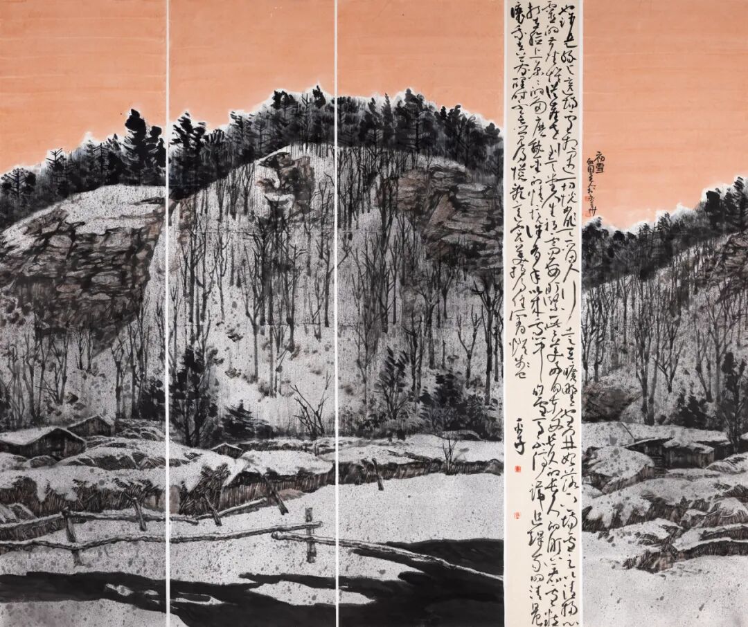 张平子主要描绘黄土高原旷远的山川特色,他以墨为主,注重墨色的沉稳和厚重,通过不同的墨色层次来表现画面的远近、虚实和空间感,再以淡墨和少量色彩来表现枯树、荒草等元素,使整个画面呈现出一种苍凉、萧瑟的氛围,进一步强化了苍茫空寂之感。