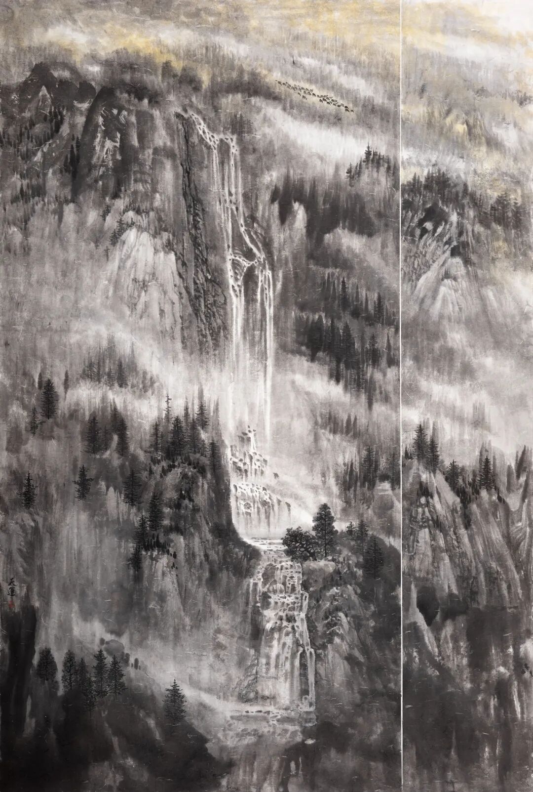 作品《沐雨听泉》是一幅充满诗意与韵味的中国山水画。该画采用水墨画的传统风格,以黑白灰三色为主色调,展现了一座山峰与瀑布的壮丽景象。画面中,山峰高耸挺拔,树木茂密葱郁,瀑布自山顶倾泻而下,如白练般悬挂于山间,形成壮观的水帘,仿佛能听到水声轰鸣,令人心旷神怡。