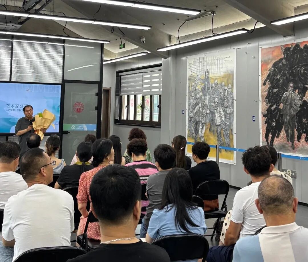 展览现场,董跃亭挥毫泼墨,尽显深厚的笔墨功底和艺术感染力。观众们穿梭于一幅幅画作之间,或与同伴轻声交流着自己的感悟,或专注地欣赏画作的细节,沉浸在艺术的世界里。