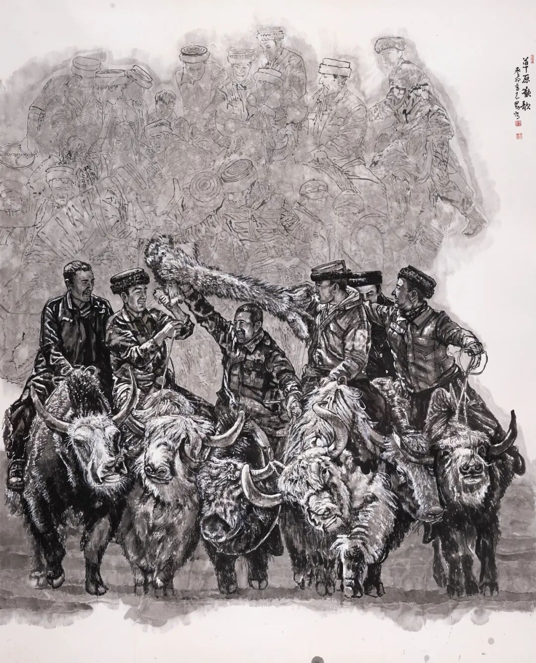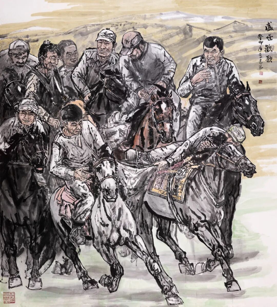 艺术家高志刚的国画人物作品,以简洁而富有力量感的线条勾勒出草原人民马背生活的轮廓,用浓淡相宜的墨色渲染出草原的广袤与苍茫,再通过细腻的色彩点缀,展现出草原生活的丰富多彩。