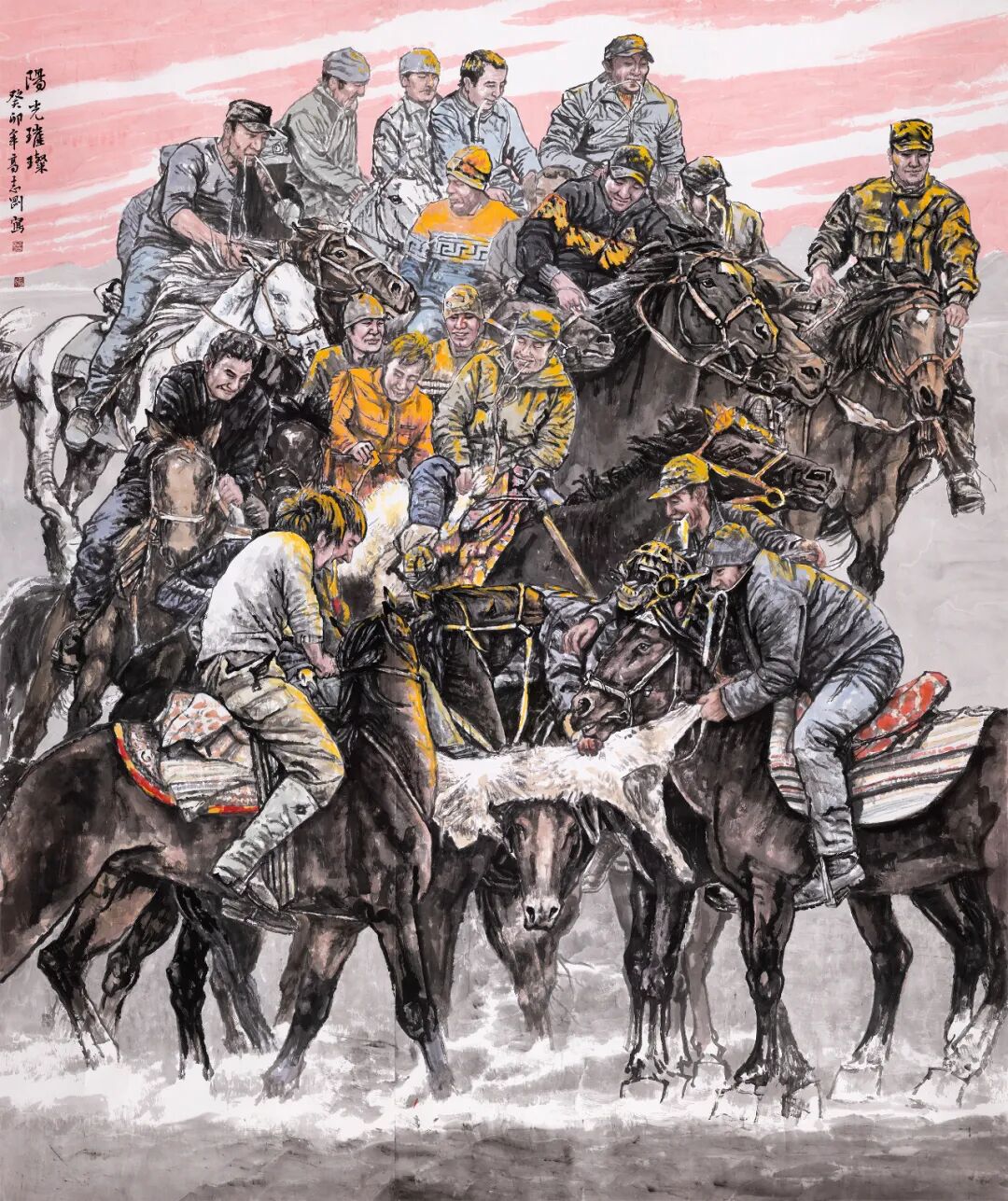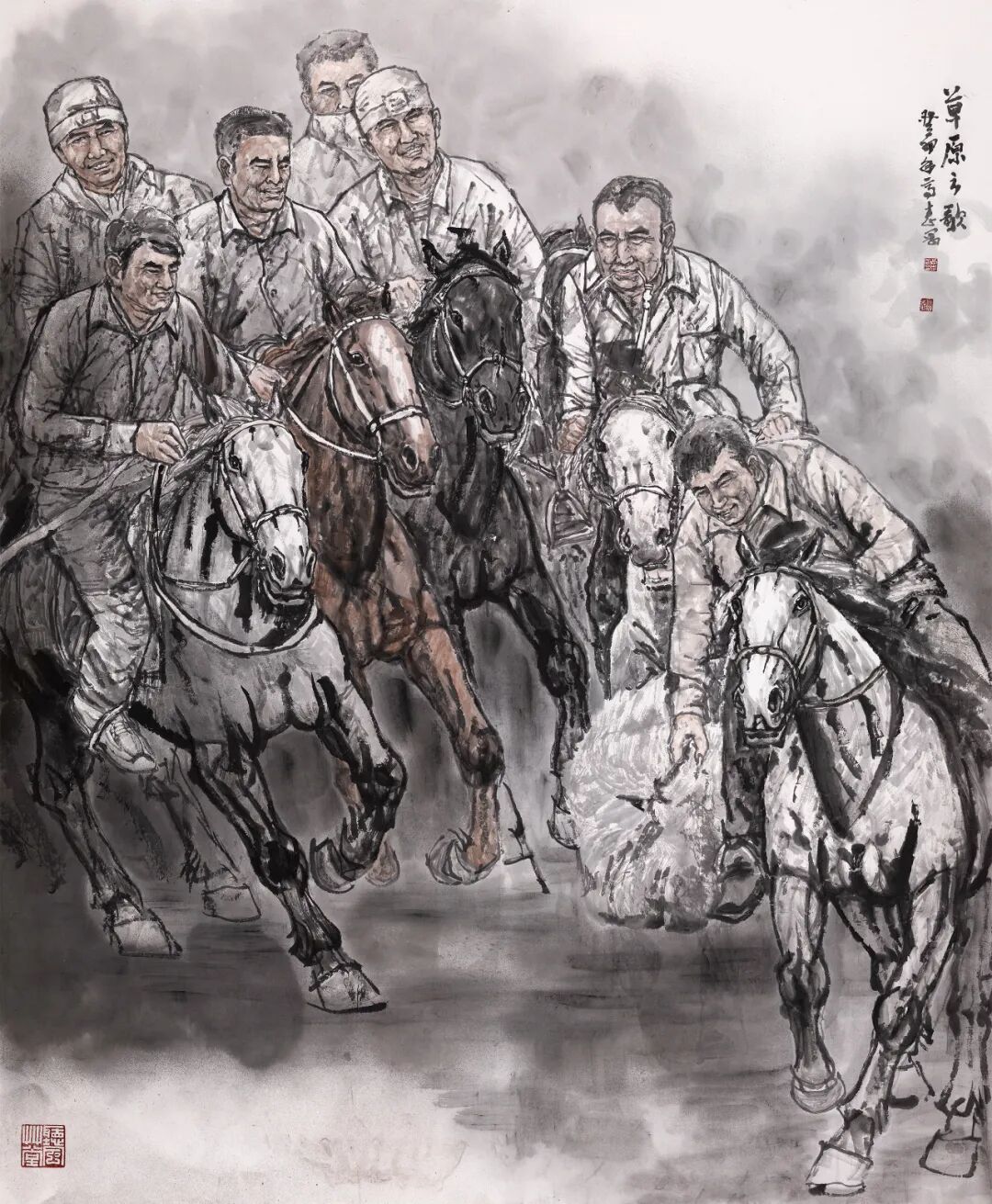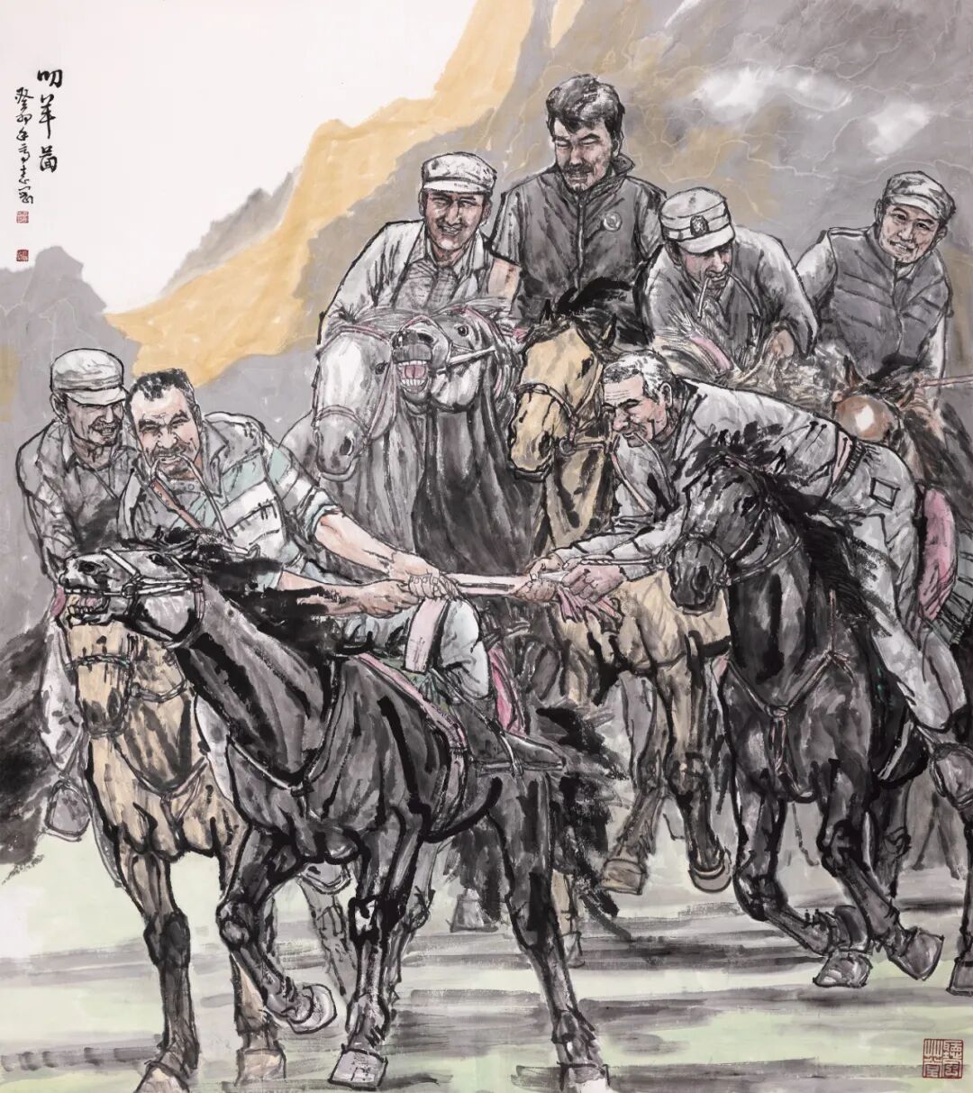高志刚能工善写,主攻人物画创作。他以热烈的笔触描绘出草原人民“叼羊”活动的场景,更传递出他们与自然和谐共生、坚韧不拔、自由奔放的精神,饱含着对草原生活的热爱与敬意。