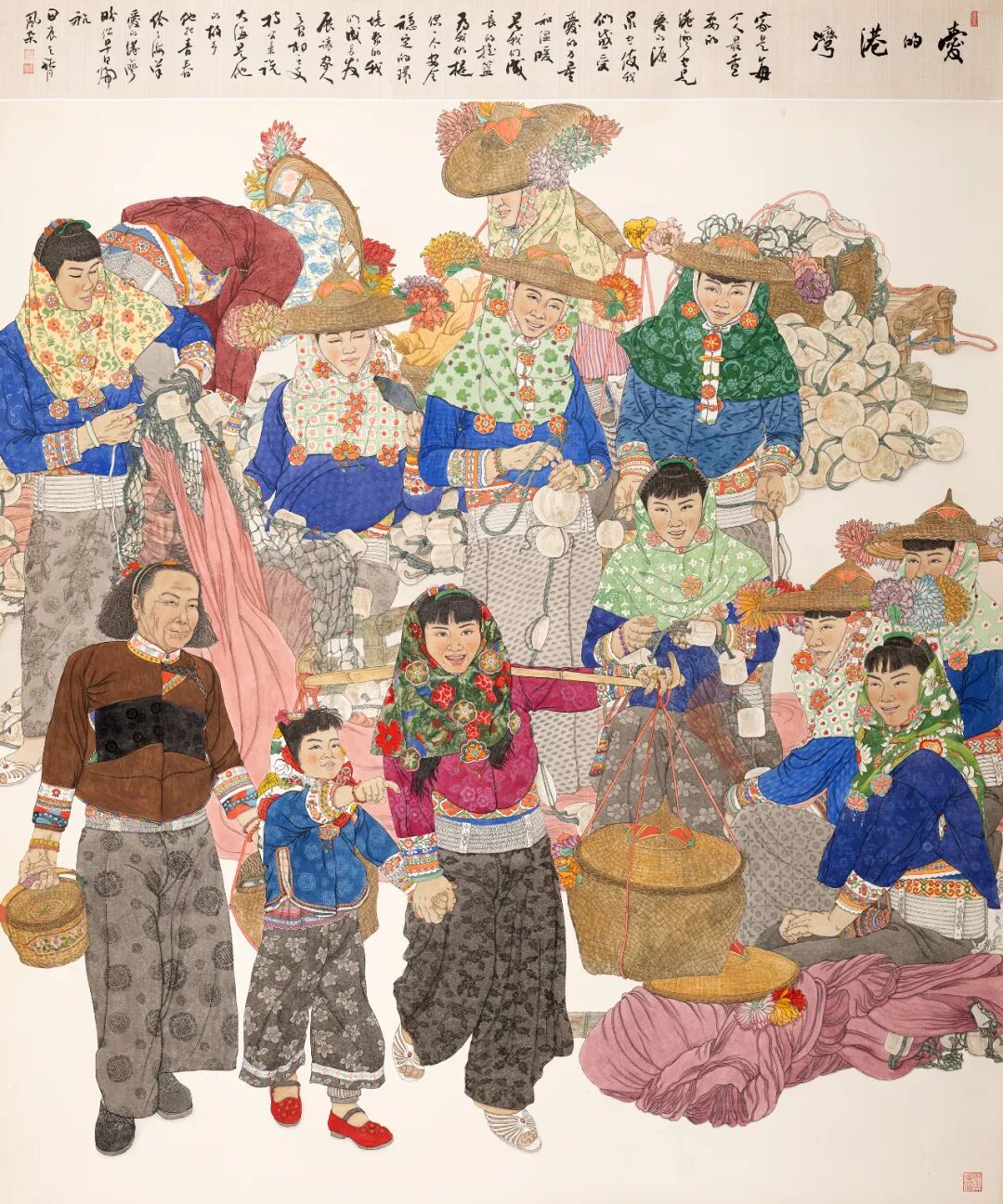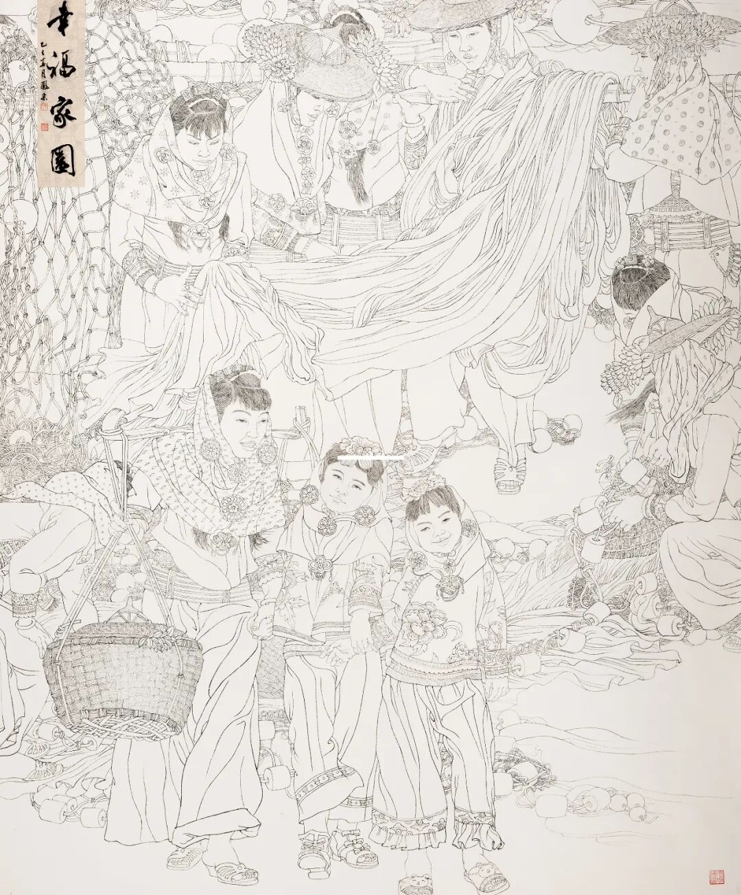 李凤朵以细腻笔触,将惠安女勤劳质朴的形象与和睦的生活场景呈现,于平凡中见幸福,展现了传统线描技法的魅力。