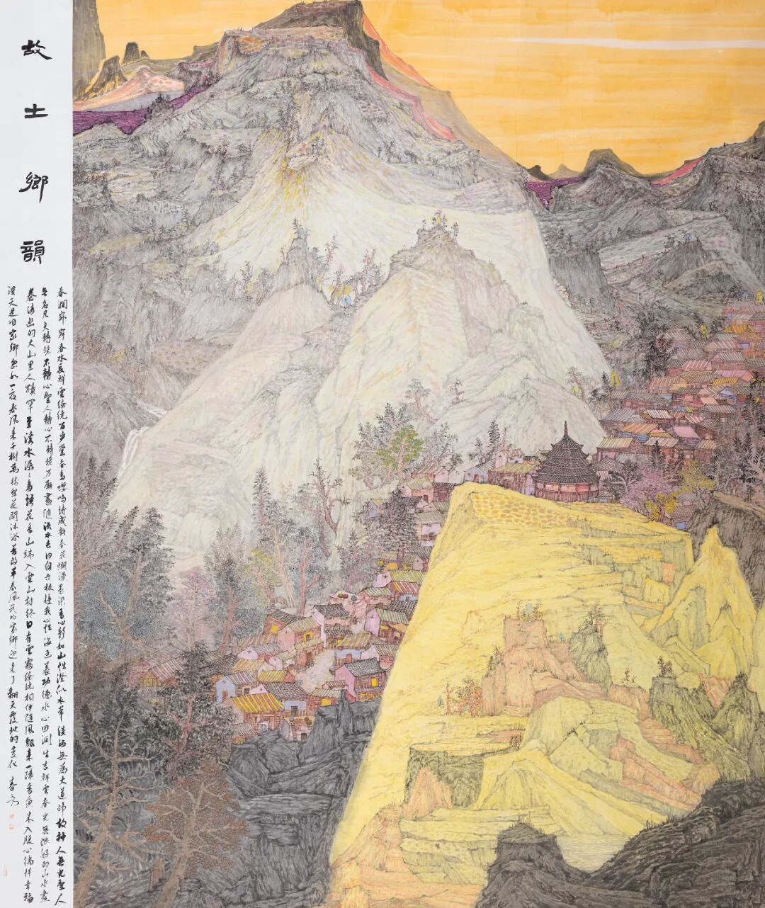 画作《故土乡韵》以其细腻的笔触和丰富的色彩,描绘了故乡的山水与人文风情。画面中,山峦起伏,村落错落,色彩运用既大胆又和谐,营造出一种温馨而宁静的氛围。画家运用光影效果,使得画面既有立体感又不失平面之美,仿佛能让人感受到故乡的温暖阳光和轻柔微风。