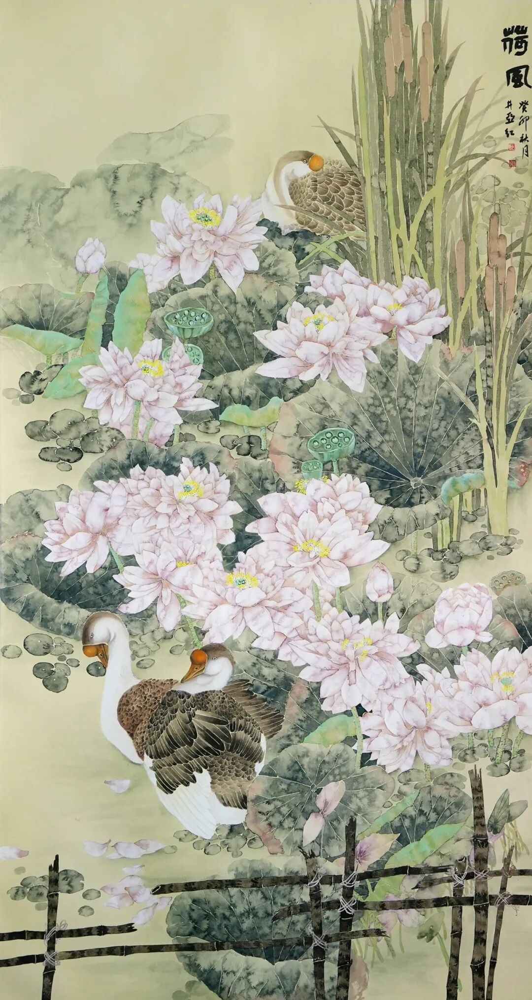 井亚红的作品创作以写生大景花鸟画为题材,创作手法以小写意,工兼写,没骨花鸟为主,又在笔墨语言中注入了鲜活的自然气息,形成了独具一格的风骨特质。