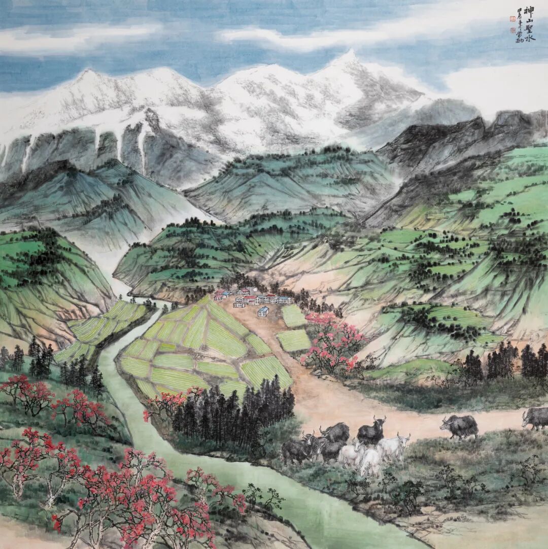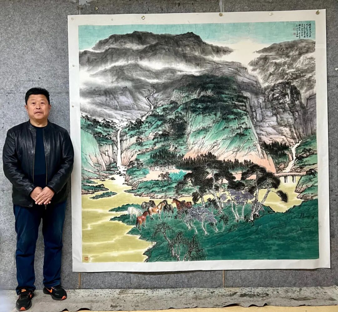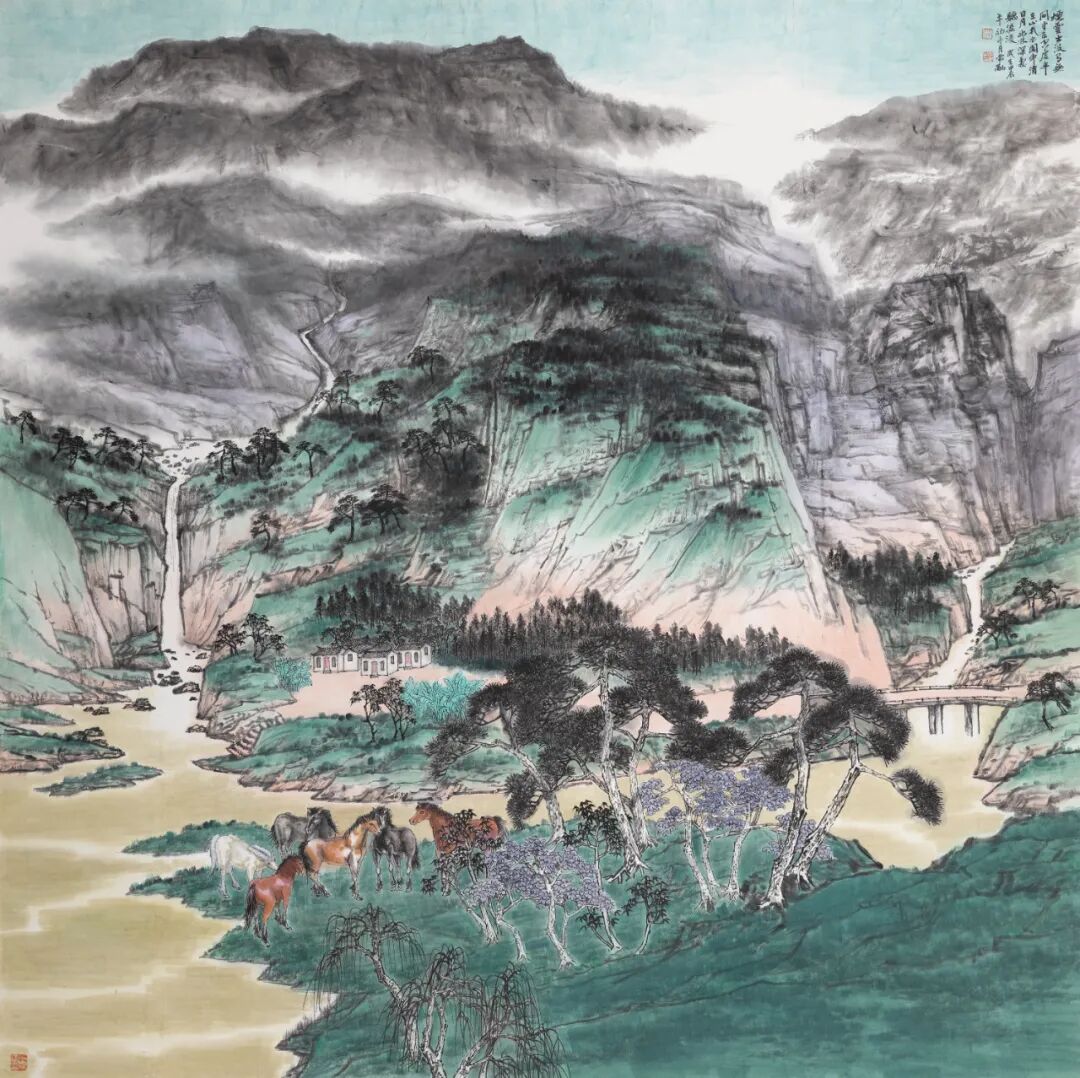 在他的山水作品中,总有动物的身影出现,或是闲散自在的牛羊成群,或是洒脱健硕的骏马数匹,它们与自然、与家园交相呼应,共同组成生机勃勃的田园山水意象,融入了当代人对乡村生活的温情记忆。