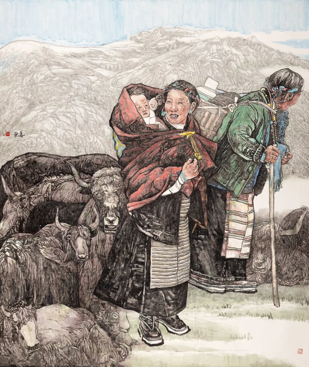 姜艳以及传统与现代交融的温度,使水墨语言从传统题材迈向当代生活,展现了自然生活与人文生态的交织,展现了地域民族鲜活的时代风貌,勾勒出普通人物平淡、朴厚的形象,以及他们坦然面对生活的人生态度。