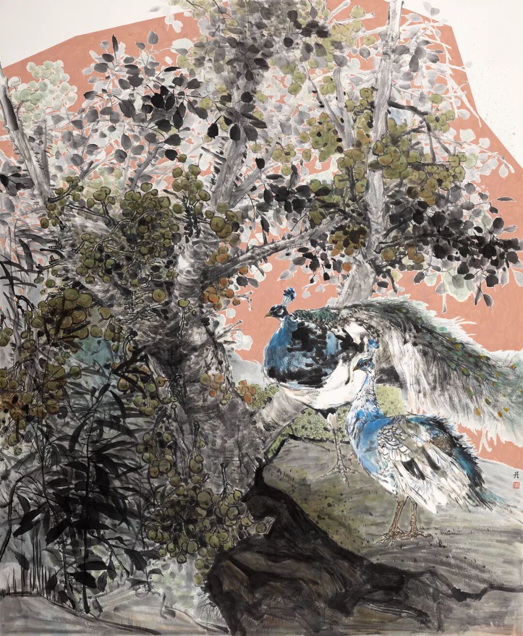如在《林间逸趣》中,她以细腻入微的笔触和流畅的线条,结合墨色的变化,将树木的枝繁叶茂、树下怪石的质感以及孔雀的形态生动地展现出来。