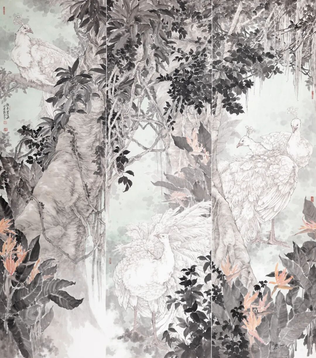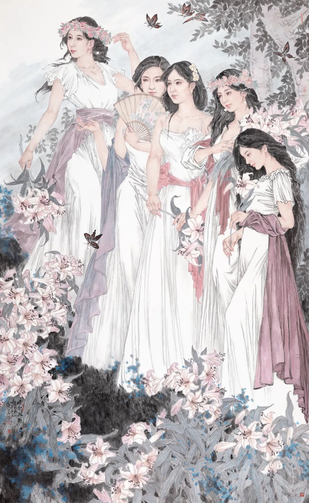 他的工笔人物,如《暗香》《春光好》,将女性的温婉柔美刻画得入木三分,情致盎然;而其花鸟之作,如《轻素碧落》《林间一片影》,则在精微细致的描绘中,透露出物我两忘的空灵与禅意。