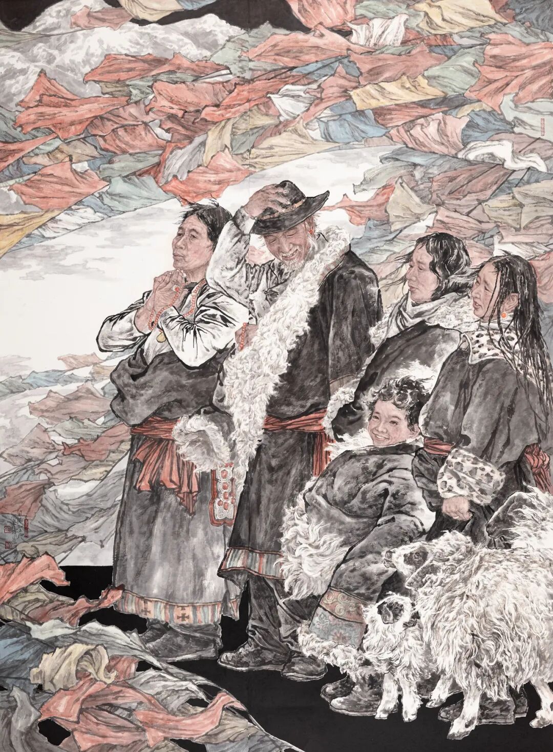 《风拂圣地》是一幅极具民族风情与艺术感染力的画作。画面中,几位身着传统藏族服饰的人物聚在一起,服饰上的毛绒装饰与鲜艳腰带尽显特色,人物神情质朴且虔诚,传递出浓厚的宗教氛围与民族情感。背景里五彩经幡随风飘动,色彩斑斓,为画面增添了灵动之感,也象征着吉祥与祝福。