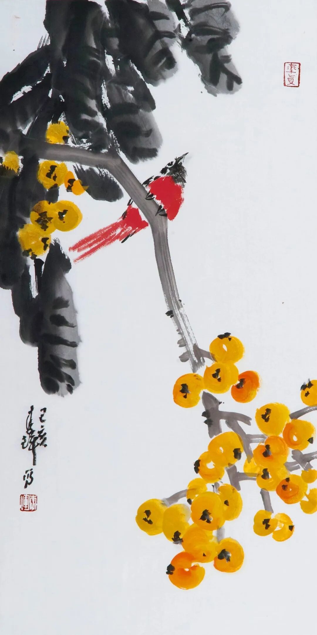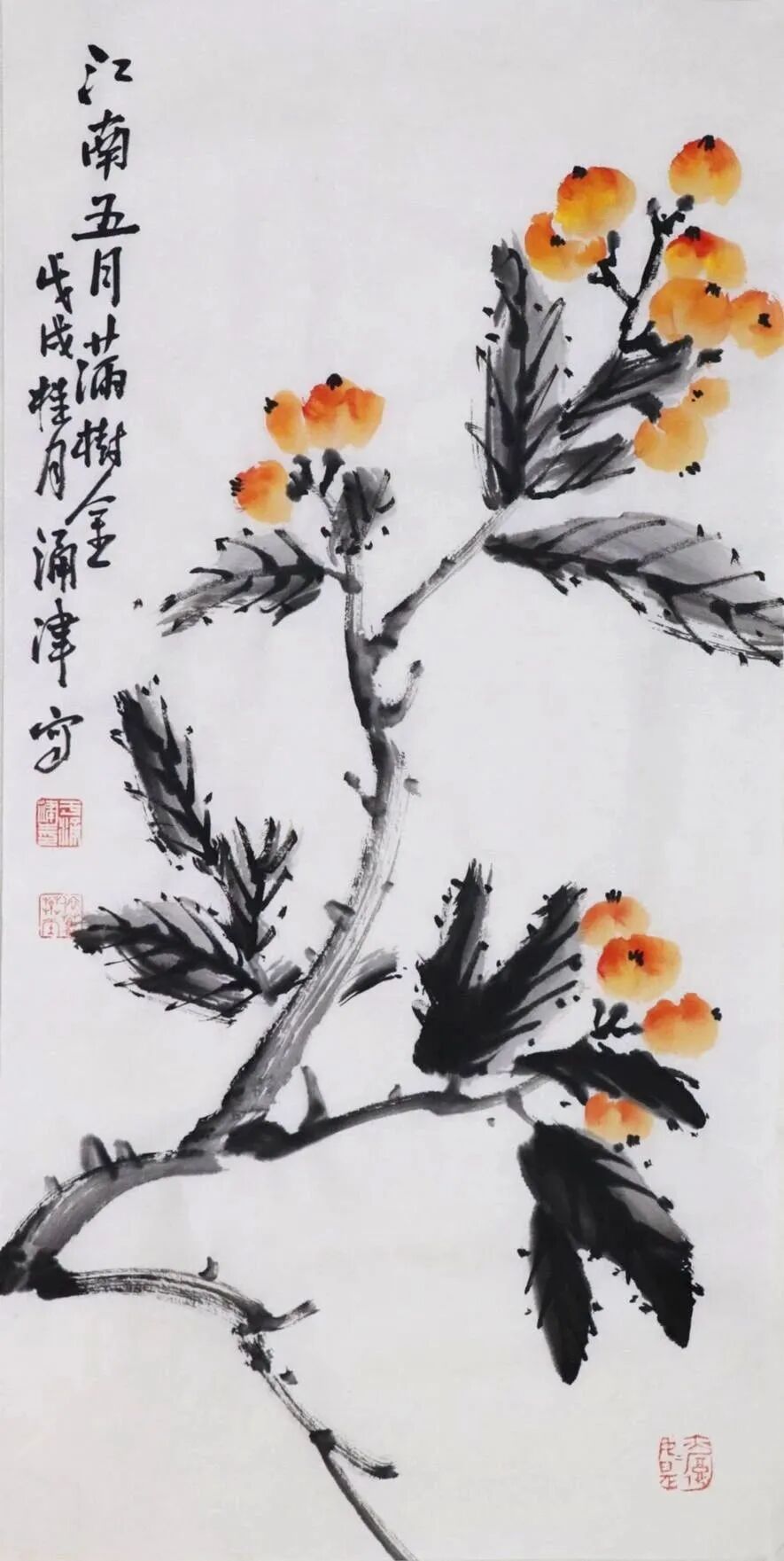 于涌津先生的此幅作品《江南五月满树金》,用墨用色别具一格,浓墨勾勒而成的叶脉使得叶子极富生机与活力,枝干苍劲挺拔,笔墨设色浓淡交错,几笔金黄着色点缀,朴拙而自然,更显满树果实鲜美亮丽,令人垂涎欲滴。