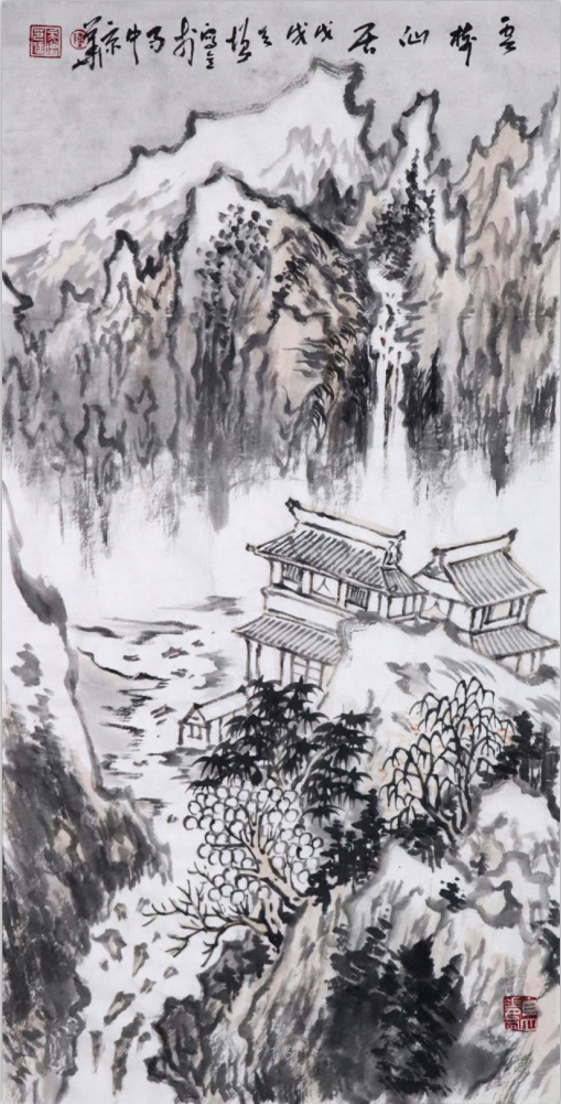 陈天增先生的作品《云梅仙居》,画面干净朴素,宁静纯美,线条流畅自然、苍劲古朴,远近分明,浓淡相宜,画中,远处群山拔地而起,云雾弥漫缭绕,近处山石陡立,腊梅含苞待放,与林木连成一片,极具风雅之美,房屋在青山秀水的环抱中愈加显得梦幻缥缈,恍若仙居,充满意境,令人无限遐想、惹人回味。
