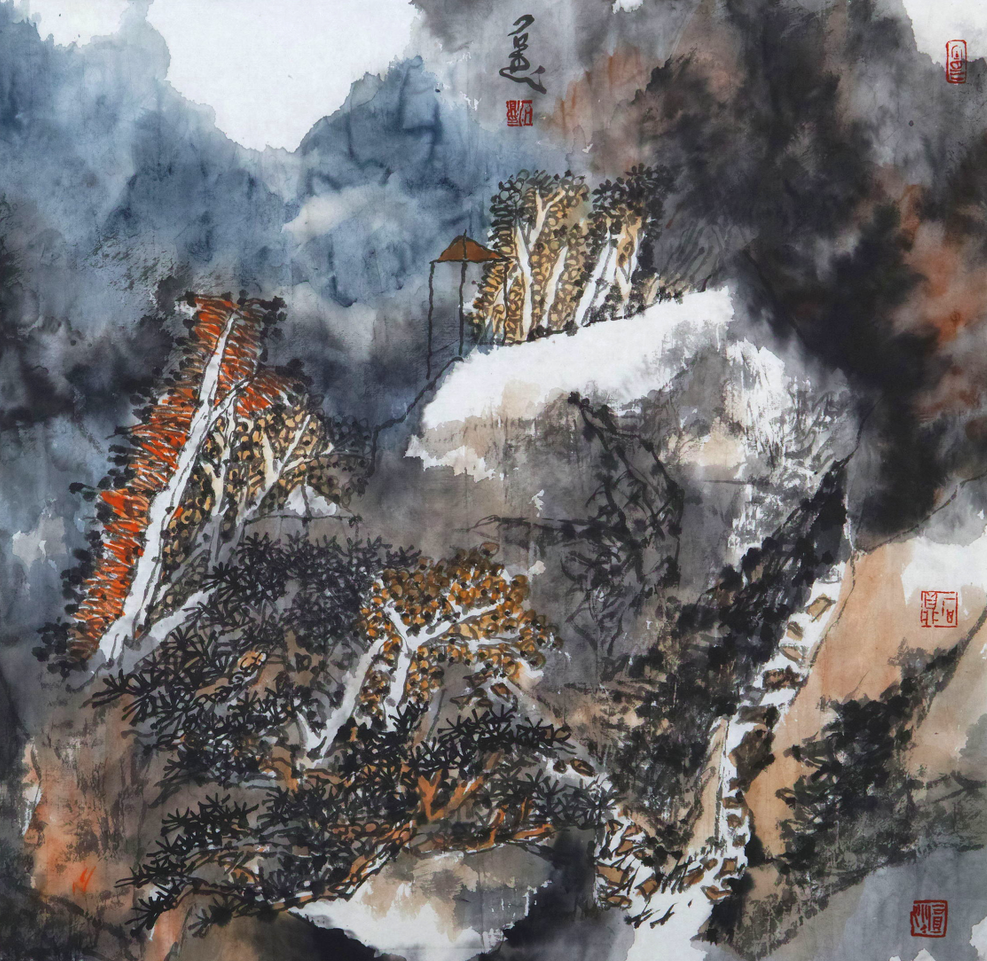 山水画作《无题》是石鼎先生的妙笔之作,画面构图饱满,疏密有序、繁简相宜,用笔老辣劲道,用墨沉郁洒脱,设色冷暖相合,画家妙以书法入画,以其独特的线条之美,融合水墨经典特色,嵌入创作激情与思悟,使得画作平添一股凌然浩渺之气和充满视觉张力之美,观之,身心荡漾、沉醉忘返。