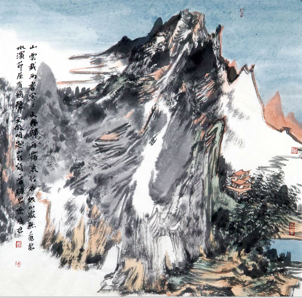房君先生笔下作品《山云载雨昼冥冥》,构图精妙,设色清雅,墨色氤氲,层次分明,画面山势挺拔,巍峨险峻,高耸入云,房屋倚山而立,幽幽湖水,清澈可人,几处艺术留白处理,提升画面质感与立体感的同时,也增加了作品画面的想象空间,细细品赏,宛如跃进了一隅清凉世界,沁人心脾。
