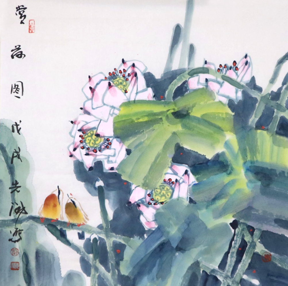 赵先闻先生极为善于表现荷花,笔下荷花作品总给人呈现出一种旺盛的生命力,作品《赏荷图》,着色明亮,冷暖相宜,墨韵淋漓,清隽如水,画家融合中西绘画优质特色,使得画面更加鲜明亮丽,处处散发着蓬勃与热烈,充满着盎然的青春灿烂。