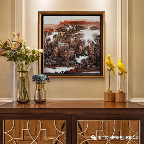作品《无题》,画家将传统国画山水精髓与红色山水画历史特性相结合,构图考究,虚实相生,气象宏远,满目红晕,初升朝阳将大地山川浸染,缥缈而唯美,温润而秀雅,作品笔与墨柔中见刚、静中有动,浑然一体,相辅相成,壮美灵秀之气溢于画面,让人仿佛置身于山水仙境之中,观之令人流连、惹人沉醉,挂于家中,不仅增加喜色与美感,也将吉祥美好之意赋予,是家居装饰的经典之作。
