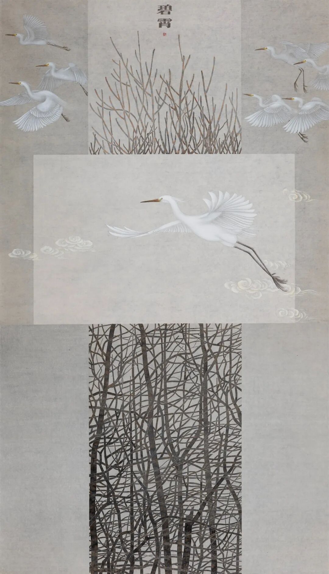 李长平对画面关系的处理十分娴熟,尤其是在《碧霄》《潜龙御长风》等花鸟作品中,黑白灰的墨色处理得当,构图新颖独特,静中有动,营造一种无声胜有声的灵动景象,画中所蕴含的生机和情感充盈而出,带给人震撼心灵的美的体验。