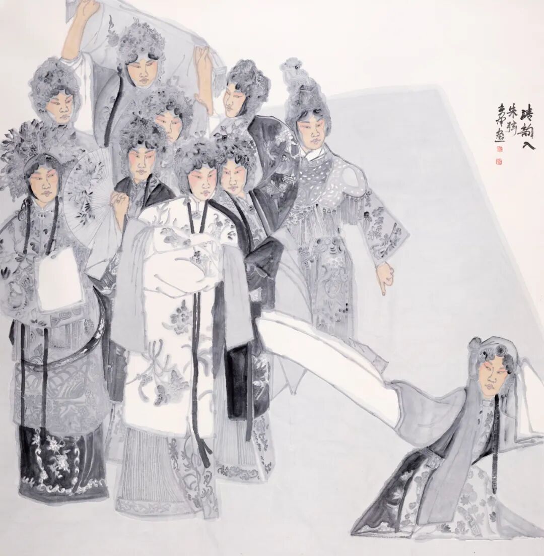 戏曲表演注重舞台的空间感,剧情一波三折,时空自由流转,演员通过动作与表情,与观众产生互动;水墨画在表现戏曲场景时,通过细腻的笔触和空灵的背景,能够传达出戏曲表演的动态与韵律,通过人物造型和情节设置,增强画作的生动性和动态美感。
